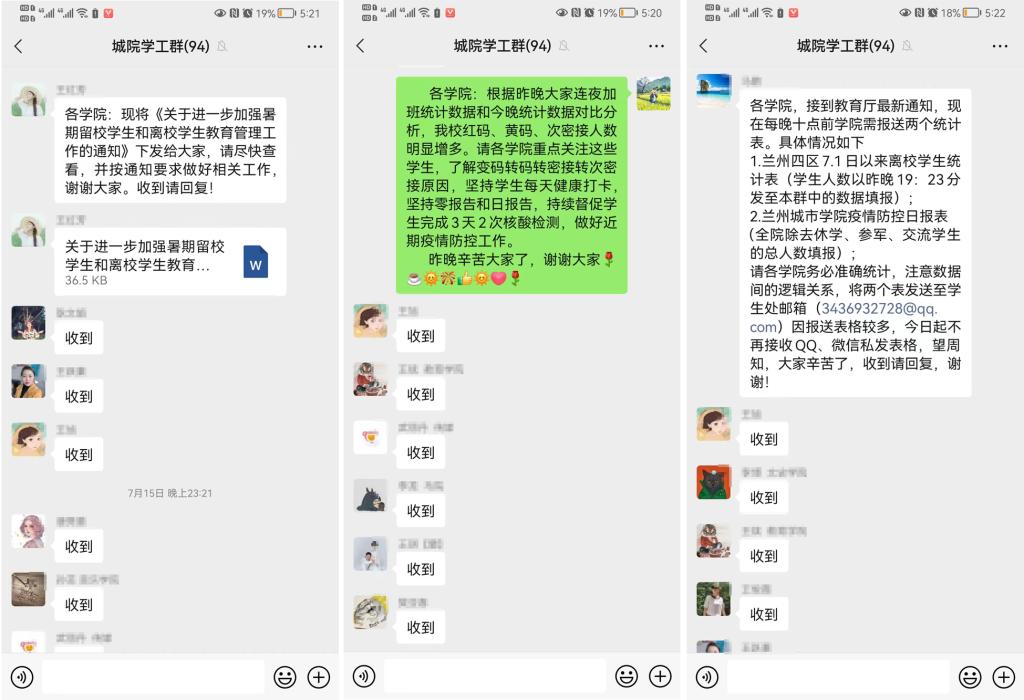 党委学生工作部(学生工作处)工作人员、学院党组织书记、班主任、辅导员等组成的学生工作干部们,通宵达旦、机不离手,通过电话、网络与11247名学生逐一进行有效对接,发送“属地报备”“拒绝非法营运车倡议”等指令,进行“家乡所在地准确信息统计”,做到台账清、数据准、底数明,高效准确地完成信息统计上报工作。党委教师工作部(人事处)认真做好教职工每天报备健康状况、出行情况、核酸检测情况、隔离居家情况,并对离兰教职工反复核对联系电话、到达目的地、离校时间、抵达时间、目的地报备情况及健康码,做细做实教职员工疫情防控工作。