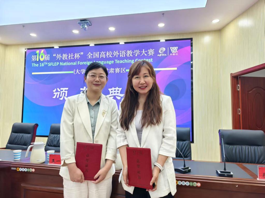 近日,甘肃省教育厅公布了第十六届“外教社杯”全国高校外语教学大赛(大学英语组)甘肃赛区获奖名单。我校外国语学院教师牛丽君、李国访在比赛中表现突出,分获综合组一等奖和视听说组三等奖,充分展示了学校外语教学教师扎实的教学功底、先进的教学理念和良好的专业素养。