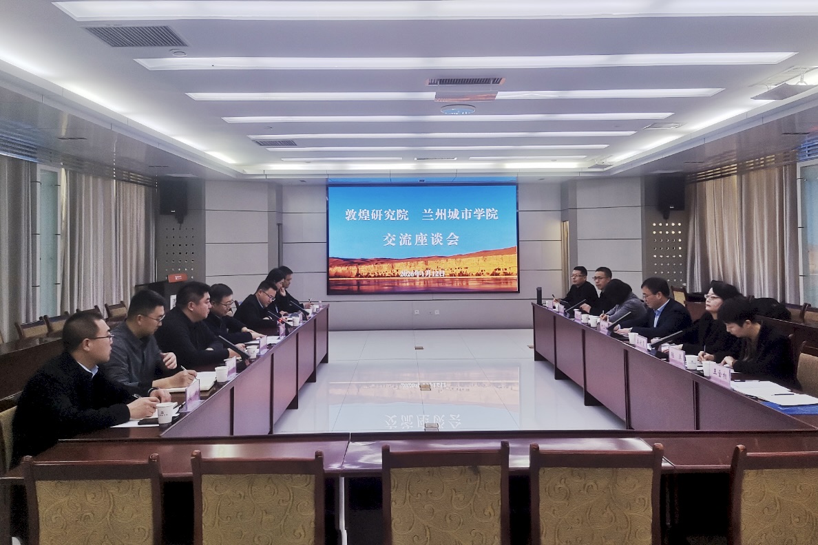1月12日下午,双方召开座谈会,敦煌研究院党委书记程亮介绍了研究院的发展概况以及在壁画修复、洞窟数字化、敦煌学研究等领域取得的成果,何玉红介绍了兰州城市学院的发展历史、学科专业特色和相关研究成果,双方相关部门负责同志围绕学科建设、人才培养、招生就业、敦煌文化翻译等领域合作事宜深入交流,达成系列共识。