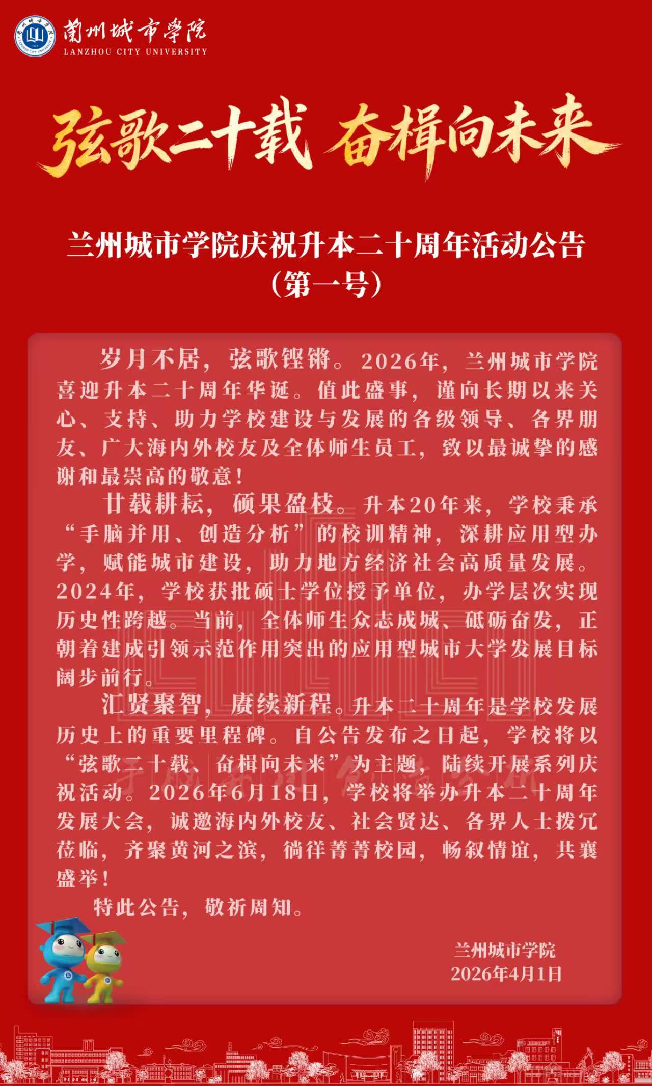 弦歌二十载 奋楫向未来 | 兰州城市学院庆祝升本二十周年活动公告(第一号)
