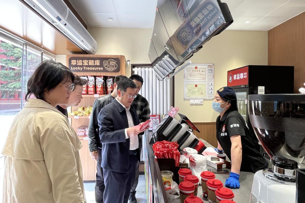 4月14日下午,校党委常委、副校长魏晋华带领国有资产管理处、党委保卫工作部、基建与后勤保障处、资产经营有限公司等相关部门负责人,组成专项检查组,深入校内塔斯汀、幸运咖、爱礼、生鲜水果店等食品经营商铺及菜鸟驿站等重点服务场所,开展校园商铺安全经营专项检查,全面排查安全隐患,压实安全责任。