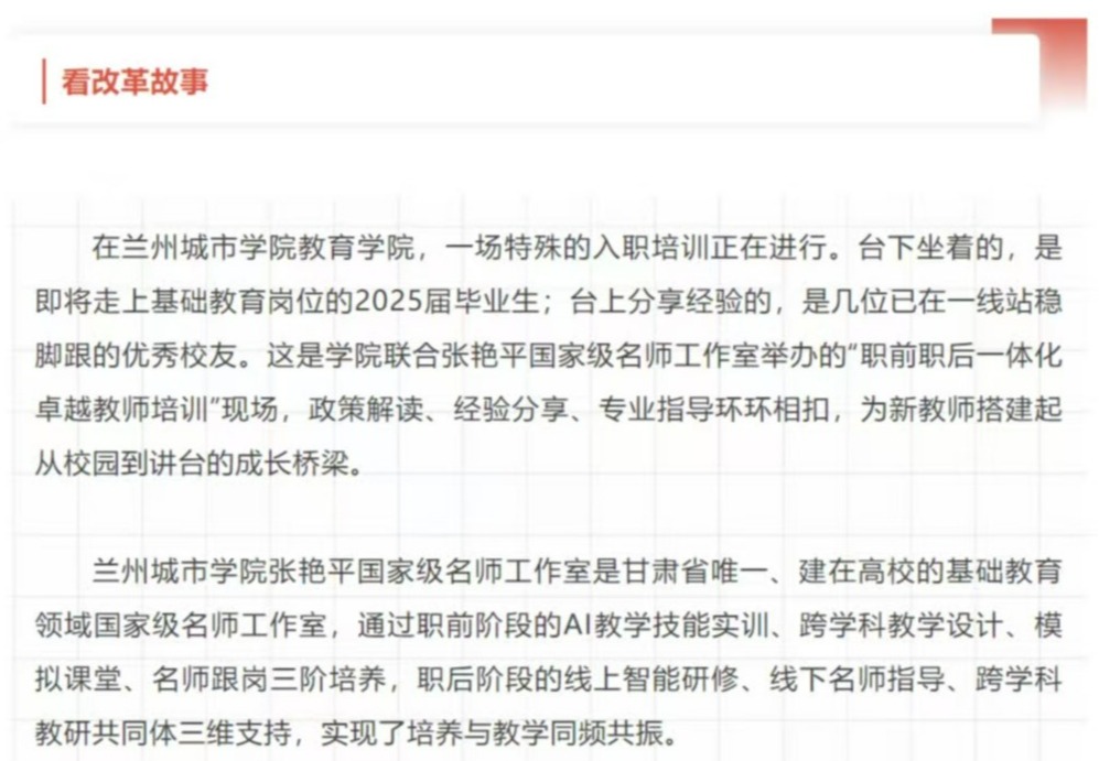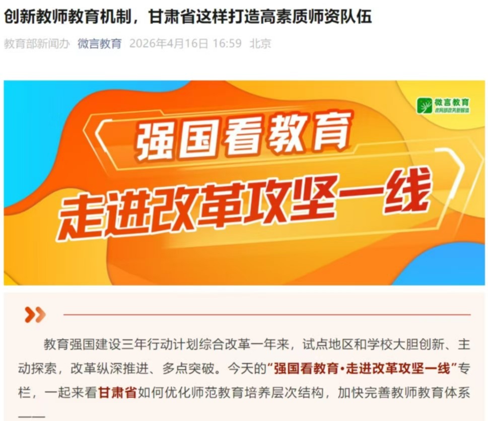 4月16日,教育部新闻微信公众号“微言教育”刊发《创新教师教育机制,甘肃省这样打造高素质师资队伍》文章,报道了我省优化师范教育培养层次结构,加快完善教师教育体系的措施举措。文章中讲述了我校教育学院和张艳平国家级名师工作室联合开展“职前职后一体化卓越教师培训”,实现培养与教学同频共振的改革故事,获得广泛关注。