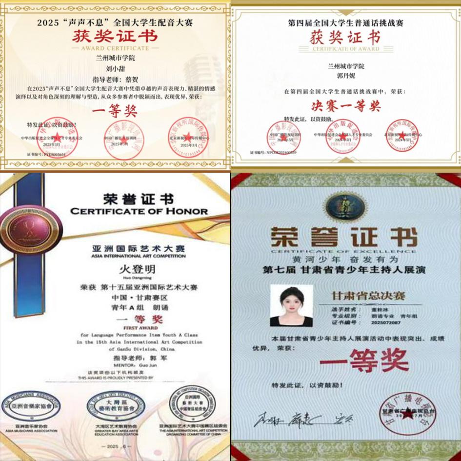 坚持“以赛促学、以赛促教、以赛促创”,将学科竞赛深度嵌入课程体系,形成“日常训练—阶段选拔—集中打磨—登台竞技”的闭环培养机制。近两年来,学生累计荣获国家级奖项10项、省级20项、地市级2项,在中华经典诵写讲大赛、国际大学生配音大赛、亚洲国际艺术大赛等高规格赛事中屡获一等奖,实现多项历史性突破。