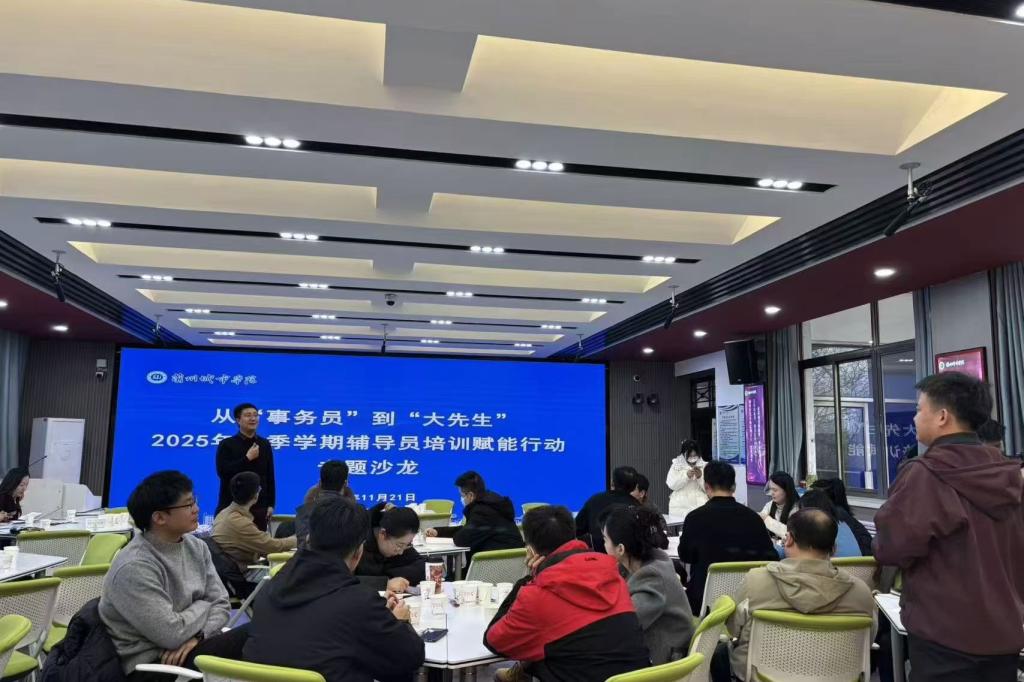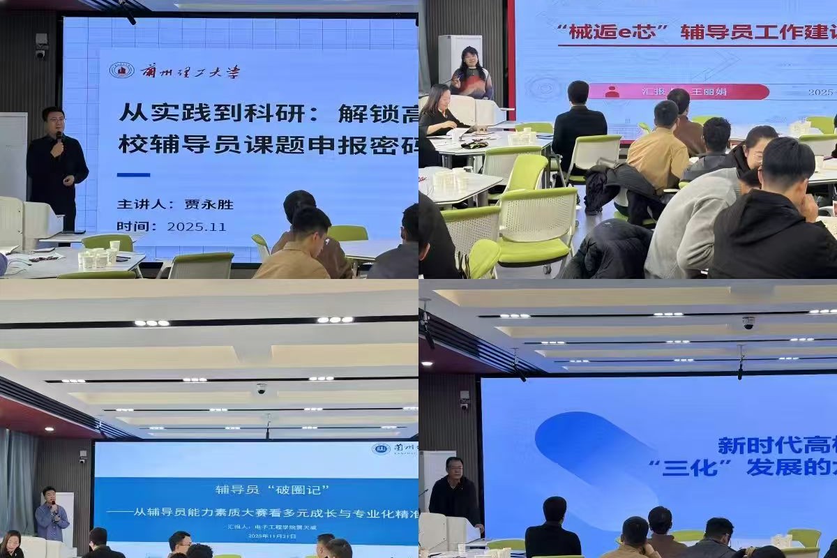 为深入学习贯彻习近平新时代中国特色社会主义思想和党的二十届四中全会精神,全面落实立德树人根本任务,深入落实学校高质量发展九大工程之《学生发展工程实施方案》,着力提升学工队伍赋能建设力,促进辅导员队伍朝着专业化、职业化方向迈进,11月21日下午,学校在校本部博文楼3316室举办2025年秋季学期辅导员培训赋能行动专题沙龙。兰州理工大学经济管理学院学工办主任、甘肃省辅导员名师工作室主持人、甘肃省青年讲师团成员、甘肃省年度辅导员人物贾永胜受邀作专题报告。全体招考辅导员、党委学生工作部相关人员参加活动。