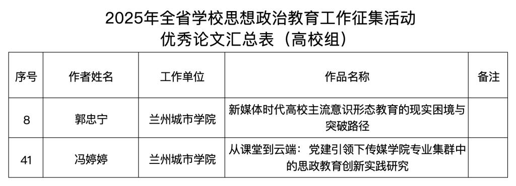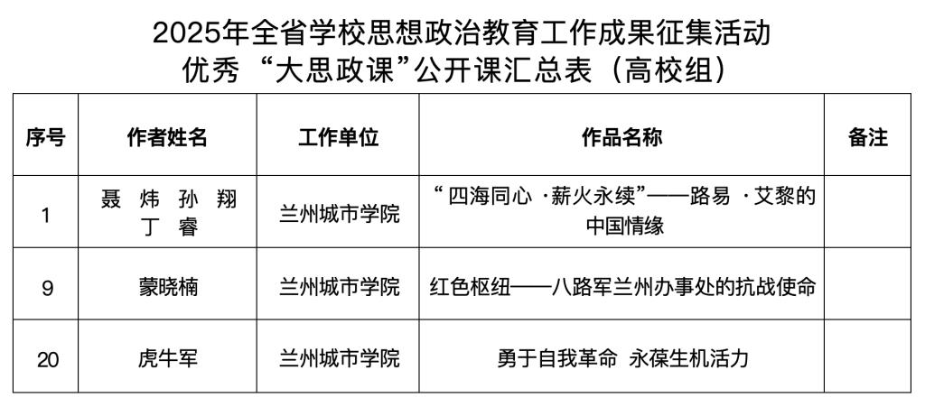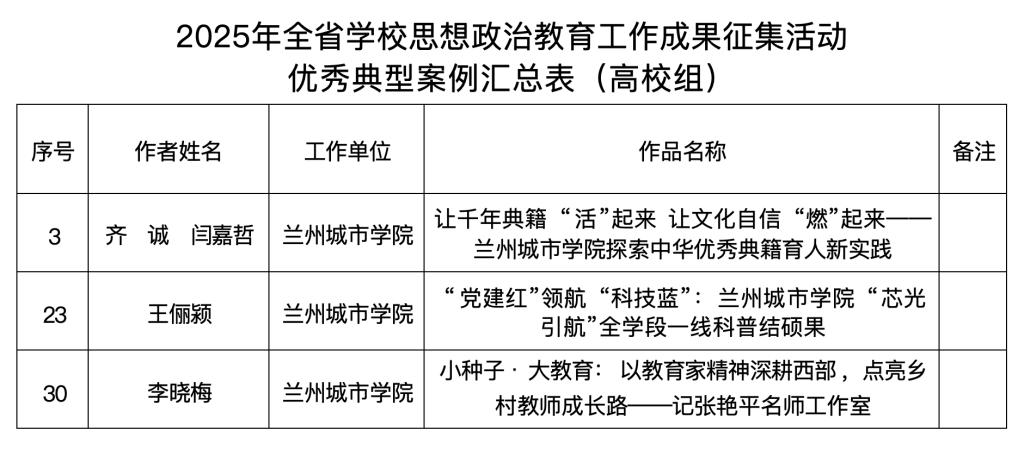 此次获奖成果涵盖三大类别:马克思主义学院教师申报的 “‘四海同心・薪火永续’——路易・艾黎的中国情缘”“红色枢纽——八路军兰州办事处的抗战使命”“勇于自我革命 永葆生机活力”3项课程,获评全省优秀“大思政课”公开课;马克思主义学院郭忠宁撰写的《新媒体时代高校主流意识形态教育的现实困境与突破路径》和传媒学院冯婷婷完成的《从课堂到云端:党建引领下传媒学院专业集群中的思政教育创新实践研究》,获评全省优秀论文;由图书馆、电子工程学院、教育学院分别申报的“让千年典籍‘活’起来 让文化自信‘燃’起来——兰州城市学院探索中华优秀典籍育人新实践”“‘党建红’领航‘科技蓝’:兰州城市学院‘芯光引航’全学段一线科普结硕果”“小种子・大教育:以教育家精神深耕西部,点亮乡村教师成长路——记张艳平名师工作室”,获评全省优秀案例。