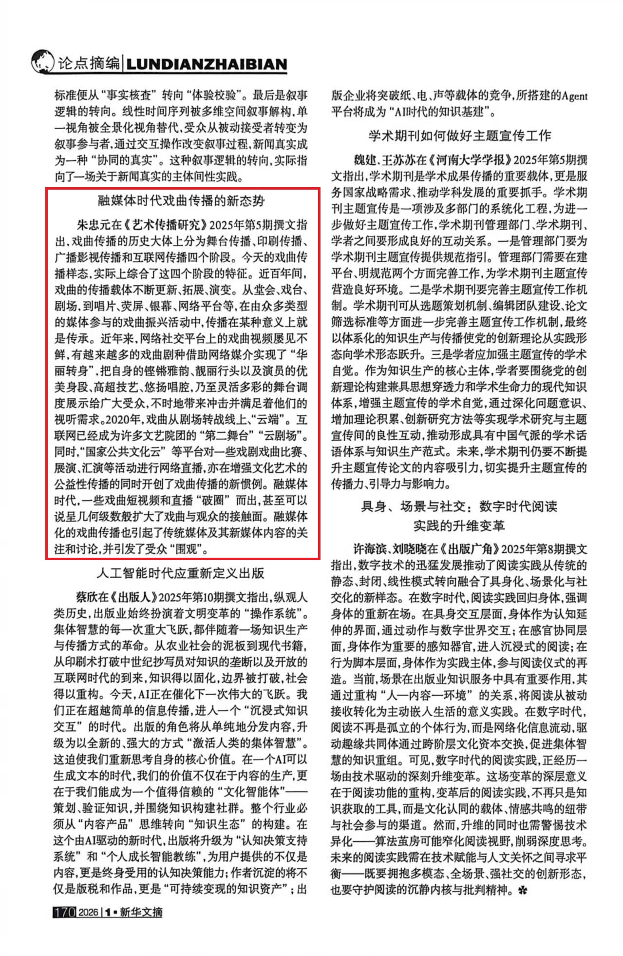 近日,我校学报编辑部朱忠元教授发表于《艺术传播研究》2025年第5期的学术论文《融媒时代戏曲传播与评论的新态势》,被《新华文摘》2026年第1期以“论点摘编”形式收录,摘编题目为《融媒体时代戏曲传播的新态势》。