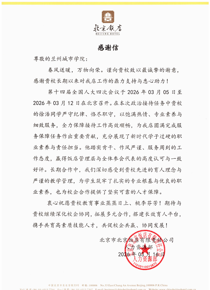 北京饭店在感谢信中表示,徐浩“充分展现了新时代学子过硬的职业素养与责任担当”,同时肯定了学校“先进的育人理念与严谨的教学管理”,认为良好的教育环境为学生快速适应岗位需求提供了坚实保障。