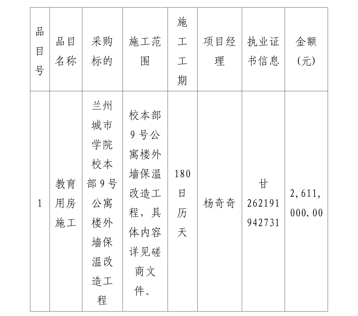 合同包1(兰州城市学院校本部9号公寓楼外墙保温改造工程):