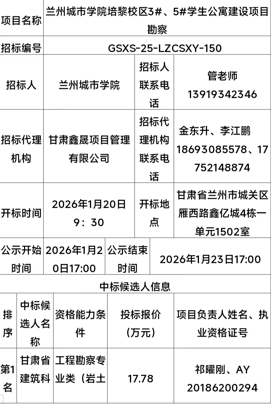 兰州城市学院培黎校区3#、5#学生公寓建设项目勘查中标候选人公示