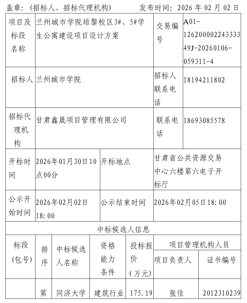 兰州城市学院培黎校区3#、5#学生公寓建设项目设计方案中标候选人公示