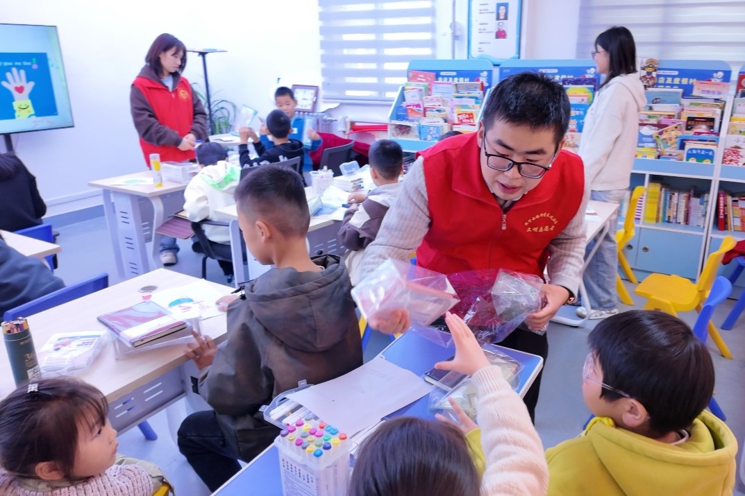 活动通过心理团辅破冰游戏、主题心理团辅、安全教育实景模拟等环节,发挥应用心理学专业优势,帮助社区儿童提升人际交往能力与安全意识。在志愿者引导下,孩子们参与了“桃花朵朵开”“水到渠成”等团队协作游戏,以及“微笑接力”“共绘友情画”等主题互动,在轻松氛围中学习表达、倾听与合作。活动还开展了防溺水、防走失等实景模拟教育,增强儿童自我保护意识。活动中,学生党支部负责人与志愿者还为孩子们发放笔袋、笔记本等学习用品,鼓励他们努力学习、健康成长。