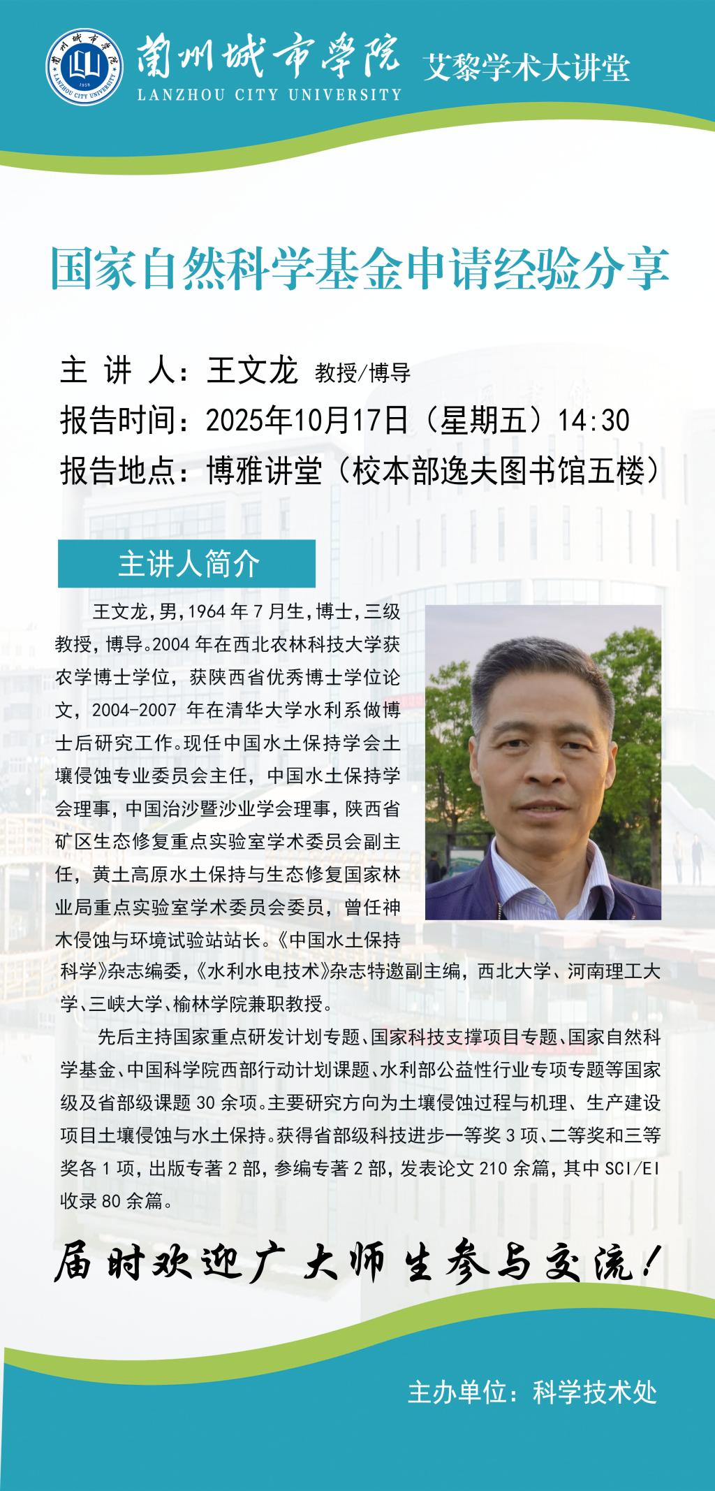 应科学技术处邀请,中国水土保持学会土壤侵蚀专业委员会主任王文龙教授为我校教师作学术报告。具体事宜公告如下: