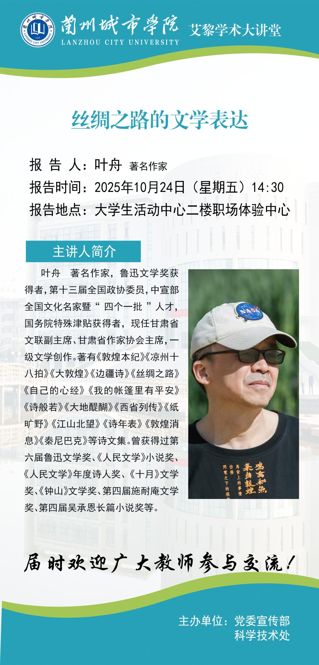 应党委宣传部、科学技术处邀请,甘肃省文联副主席,省作协主席叶舟来我校作学术报告。具体事宜公告如下: