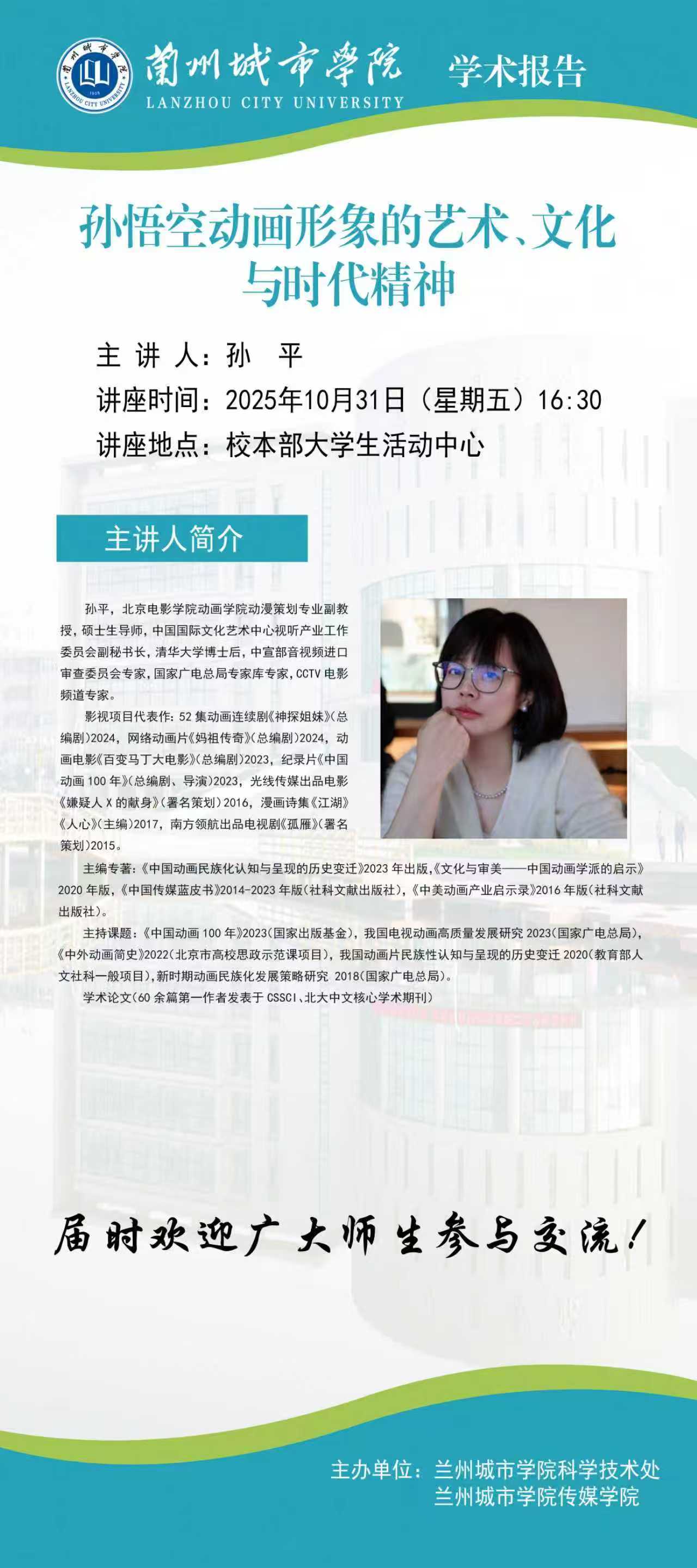 应科学技术处和传媒学院联合邀请,北京电影学院动画学院动漫策划专业副教授,硕士生导师孙平来我校作学术报告。具体事宜公布如下: