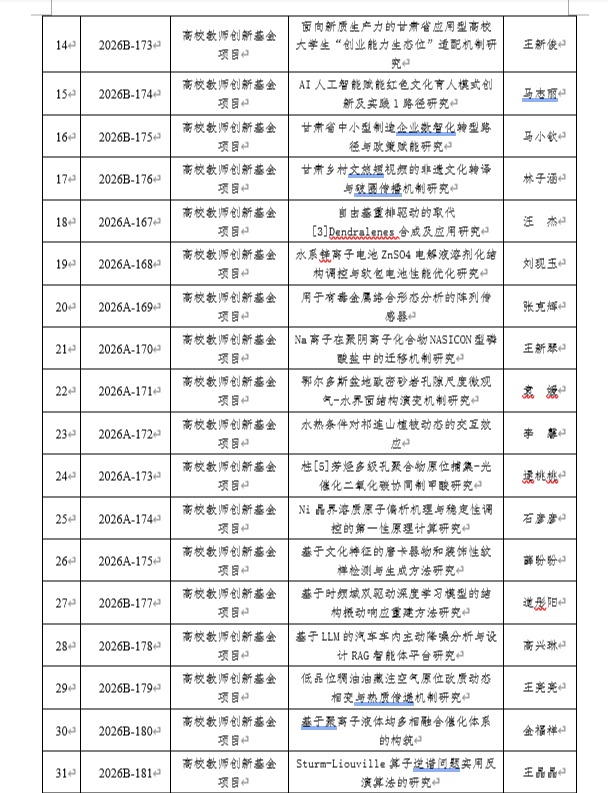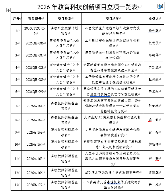 近日,甘肃省教育厅2026年教育科技创新项目立项结果公布,我校共有36项课题获准立项,其中高校产业支撑计划项目1项,高校青年博士“入企入园”项目5项,高校教师创新基金项目30项,资助总经费74万元,详情见下表。